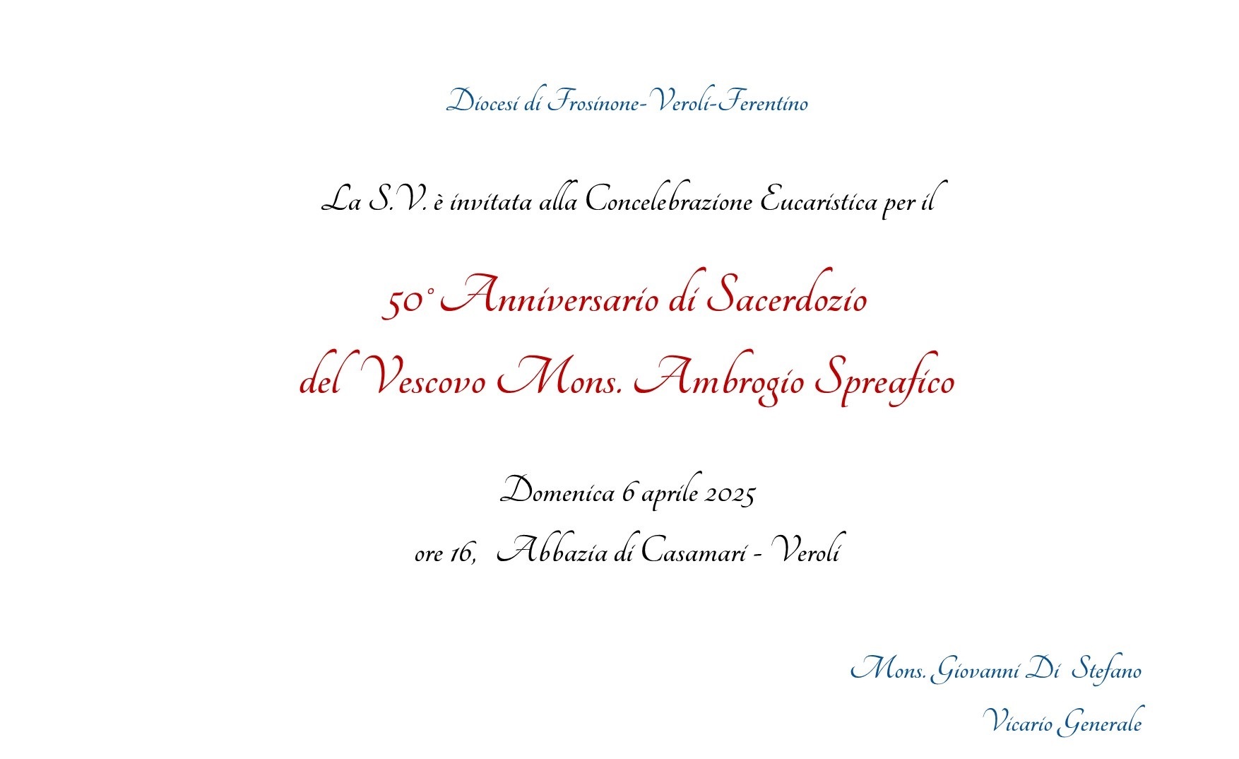 Per tutti l’appuntamento sarà presso l’Abbazia cistercense di Casamari, in territorio di Veroli, dove alle ore 16:00 mons. Spreafico presiederà la Concelebrazione Eucaristica.