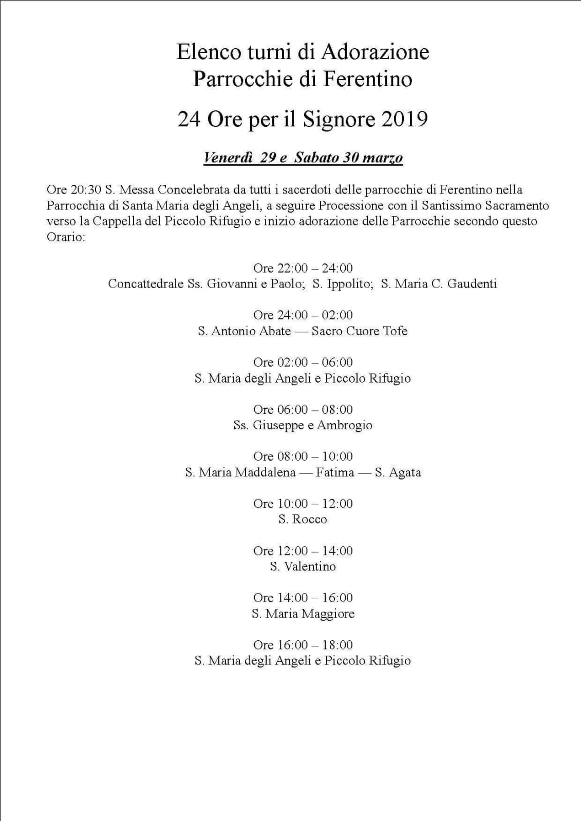A Ferentino, ad esempio, sarà coinvolta l’intera città: si inizia venerdì 29, alle ore 20.30, con la Messa concelebrata a Santa Maria degli Angeli da tutti i sacerdoti delle parrocchie cittadine; segue processione con il Ss.mo Sacramento fino alla cappella del “Piccolo Rifugio” dove l’adorazione proseguirà fino alle 18 del sabato con la presenza e l’animazione affidata alle varie parrocchie. Qui il programma delle parrocchie di Ferentino: 24_ore_per_il_Signore_2019.JPG.