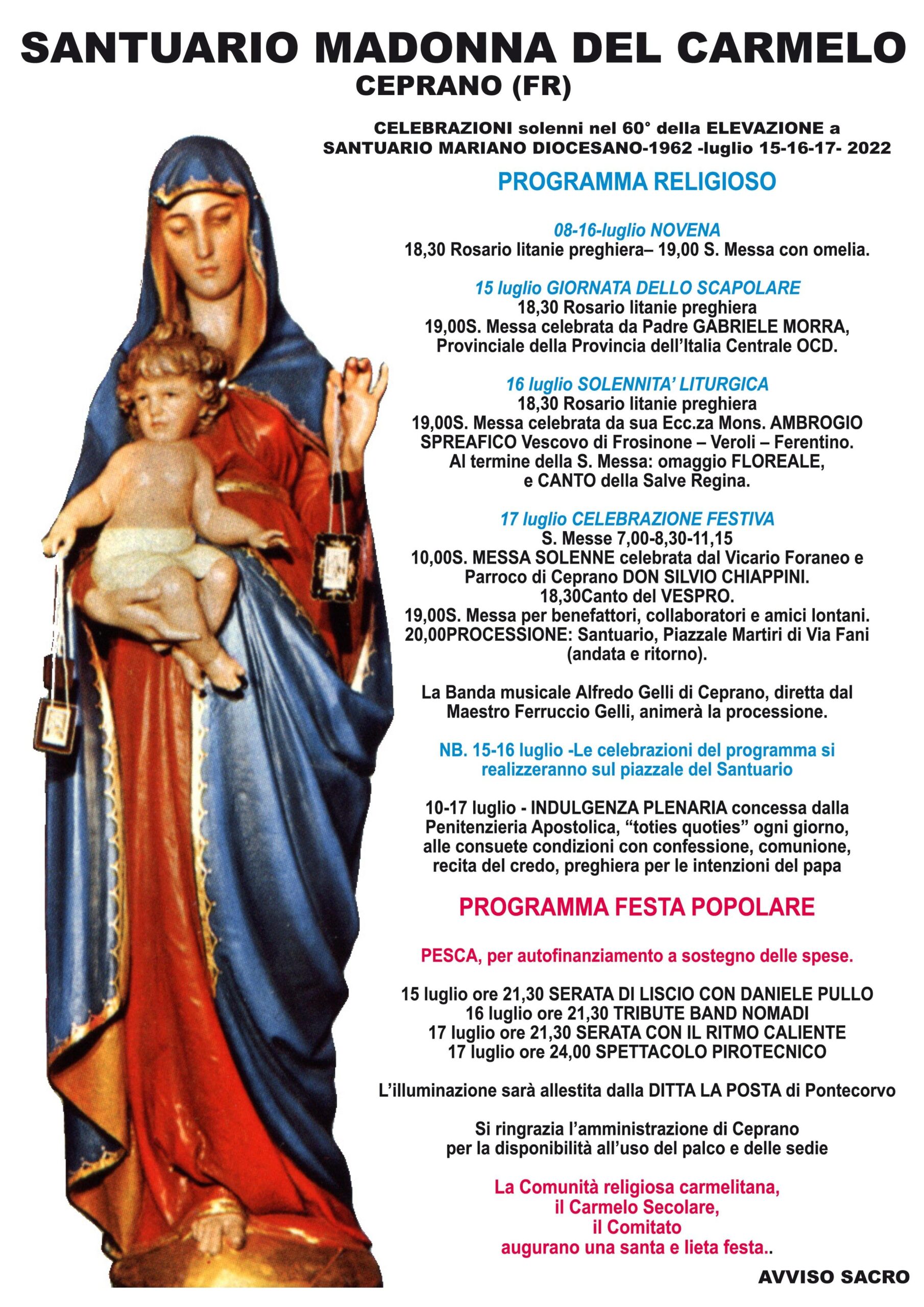 Ceprano celebra quest’anno il 60° dell’elevazione del Santuario dedicato alla Madonna del Carmine a Santuario Mariano Diocesano, avvenuta nel 1962.
