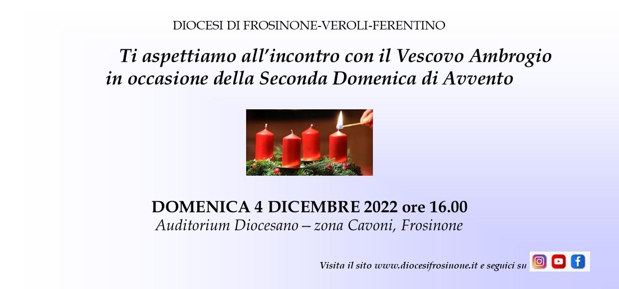 • Domenica 4 dicembre, seconda di Avvento, l’incontro del vescovo Ambrogio con tutti gli operatori pastorali della Diocesi di Frosinone-Veroli-Ferentino, tra cui i catechisti, gli educatori, i volontari della Caritas, i ministri straordinari della Comunione, gli insegnanti di religione (ore 16:00, presso l’Auditorium diocesano di Frosinone).