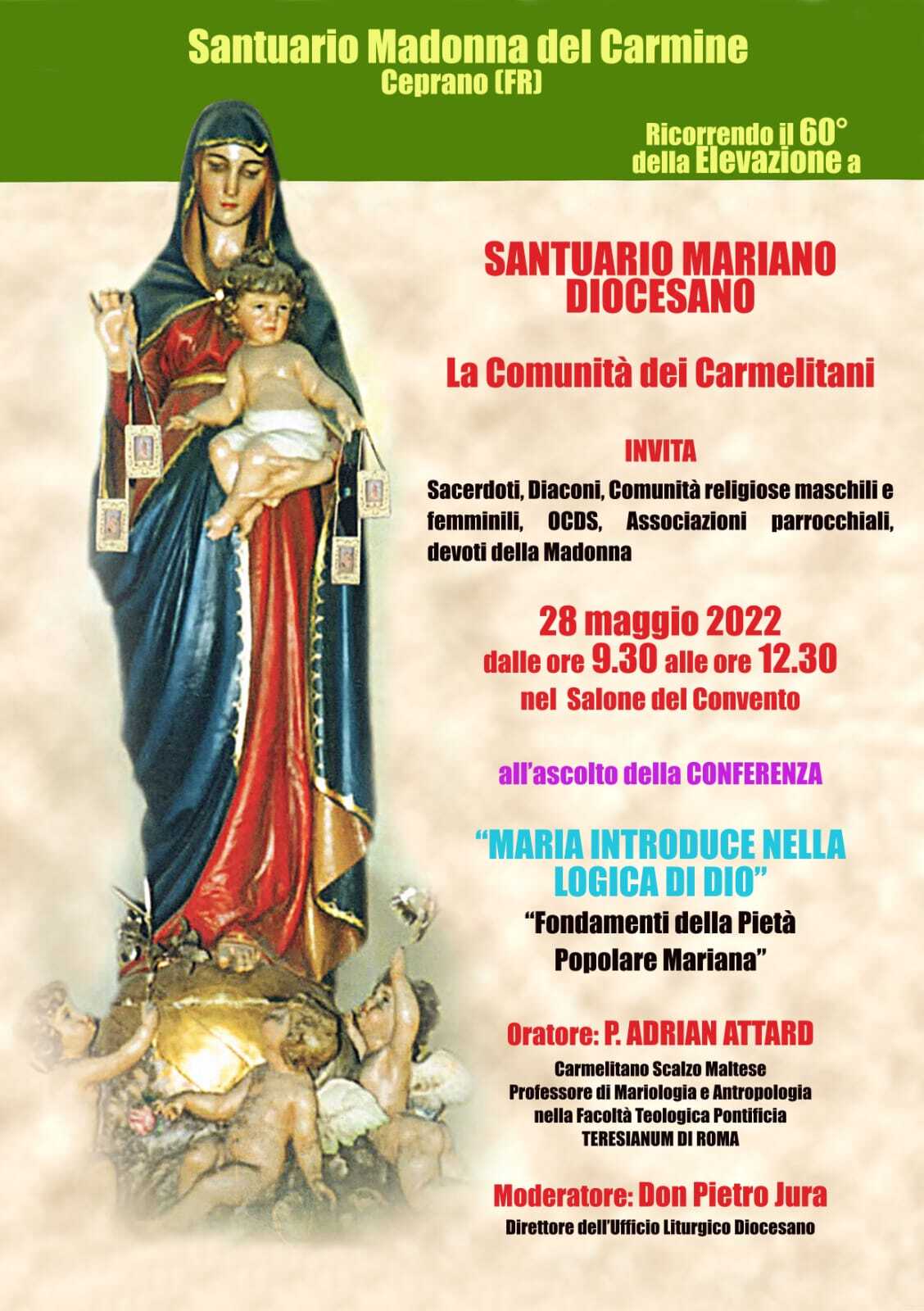 Relatore della conferenza suddetta sarà Padre Adrian Attard, Carmelitano Scalzo Maltese, Professore di Mariologia e Antropologia presso la Facoltà Teologica Pontificia “Teresanum” di Roma.