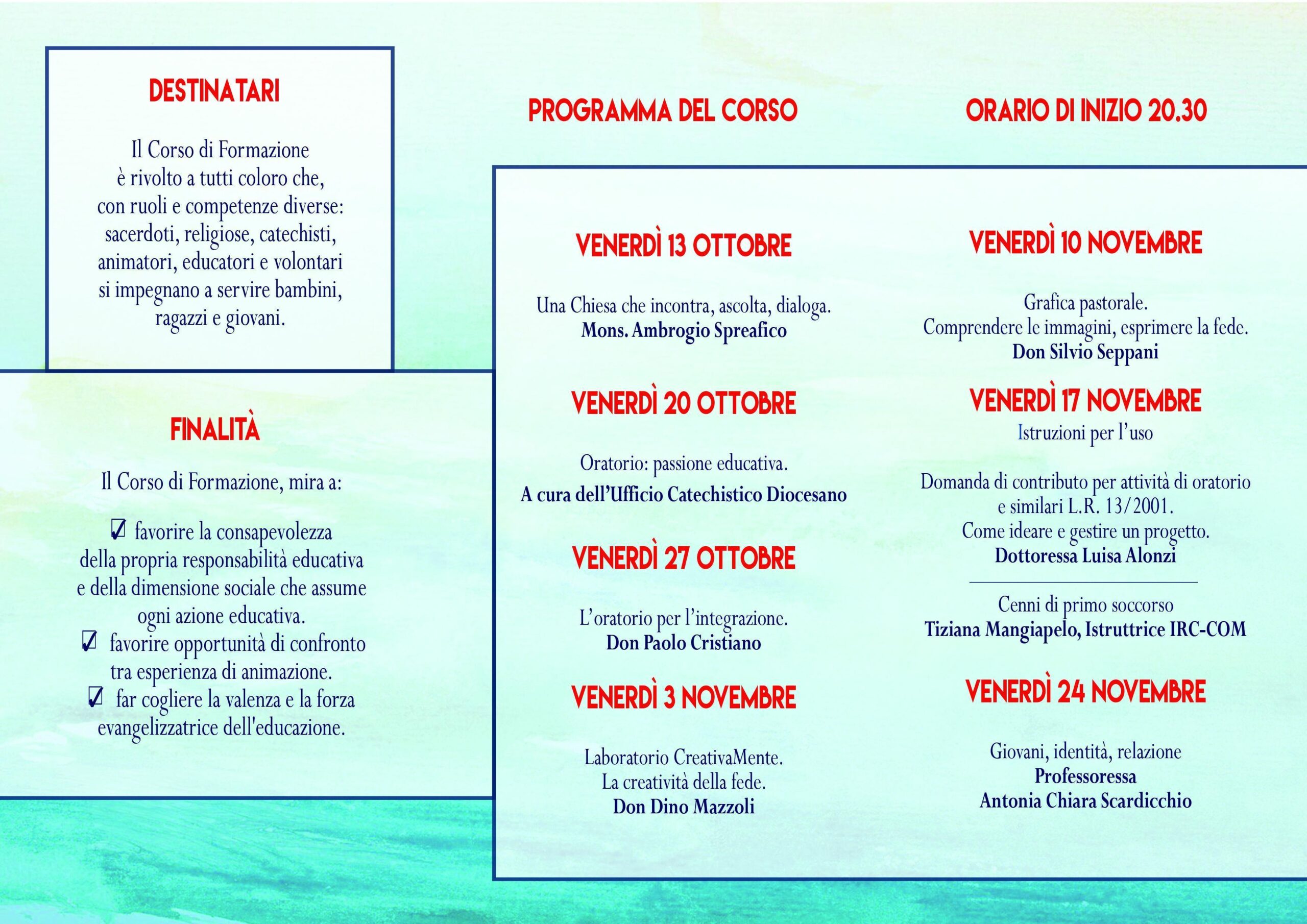 Pensato per sacerdoti, religiose, catechisti, animatori, educatori e volontari che si occupano di bambini, adolescenti e giovani negli oratori delle parrocchie della Diocesi. Un incontro a settimana, di venerdì sera, dal 13 ottobre al 24 novembre p.v. nella sala mons. Marafini dell’episcopio di Frosinone (inizio alle 20.30), con iscrizione e frequenza gratuita.