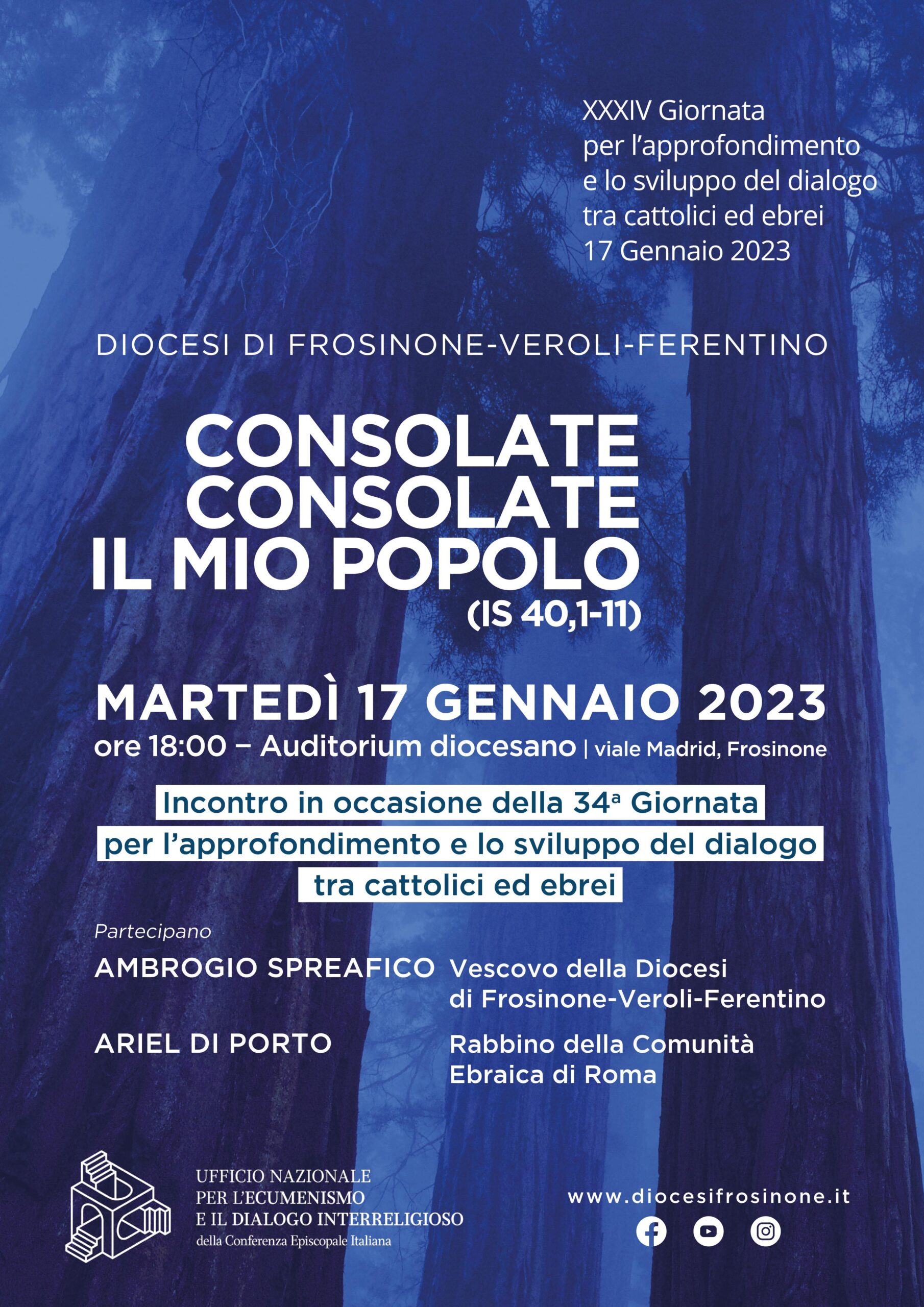 Proprio nel pomeriggio di martedì 17 gennaio 2023 l’incontro organizzato dalla nostra Diocesi: sono previsti gli interventi del vescovo Ambrogio Spreafico e del rabbino Ariel Di Porto della Comunità Ebraica di Roma.