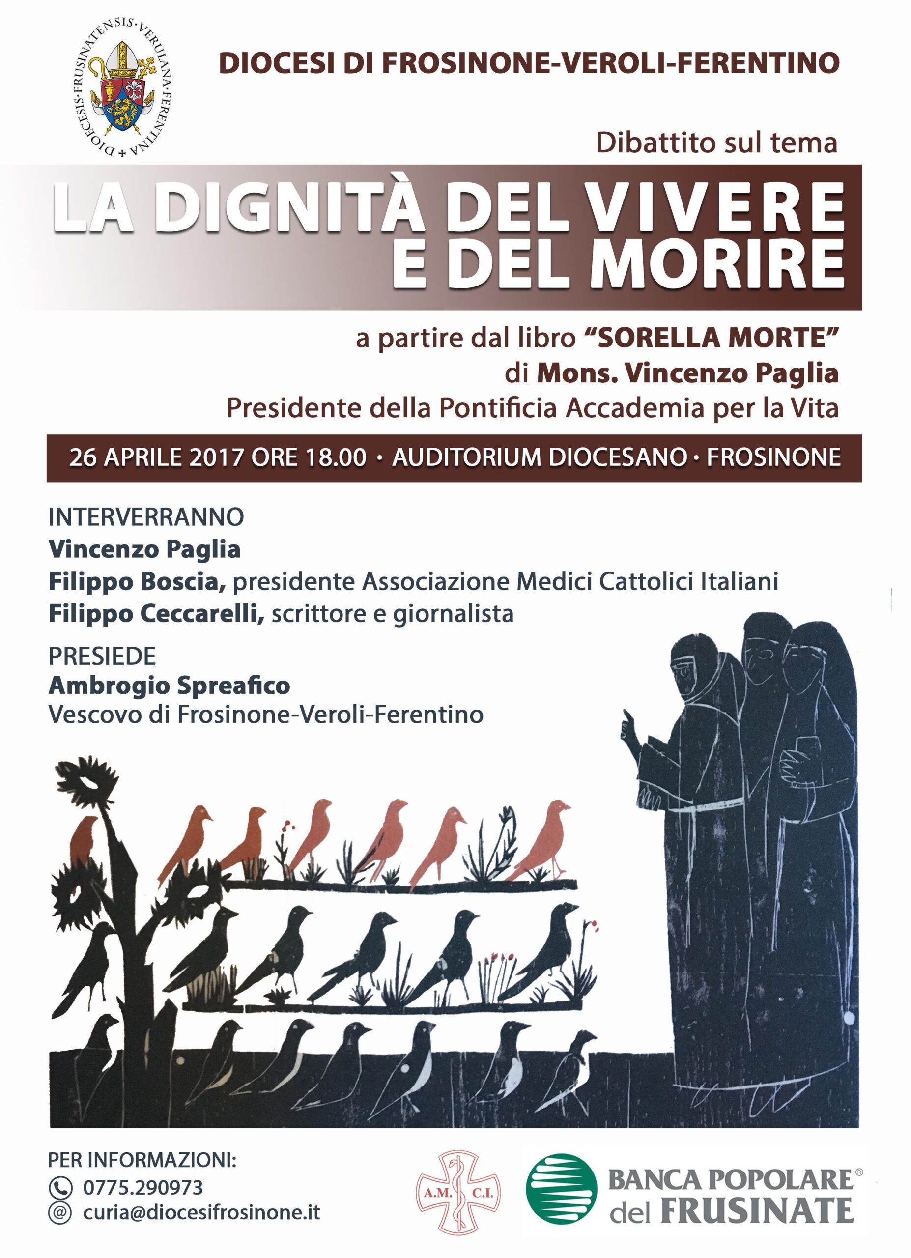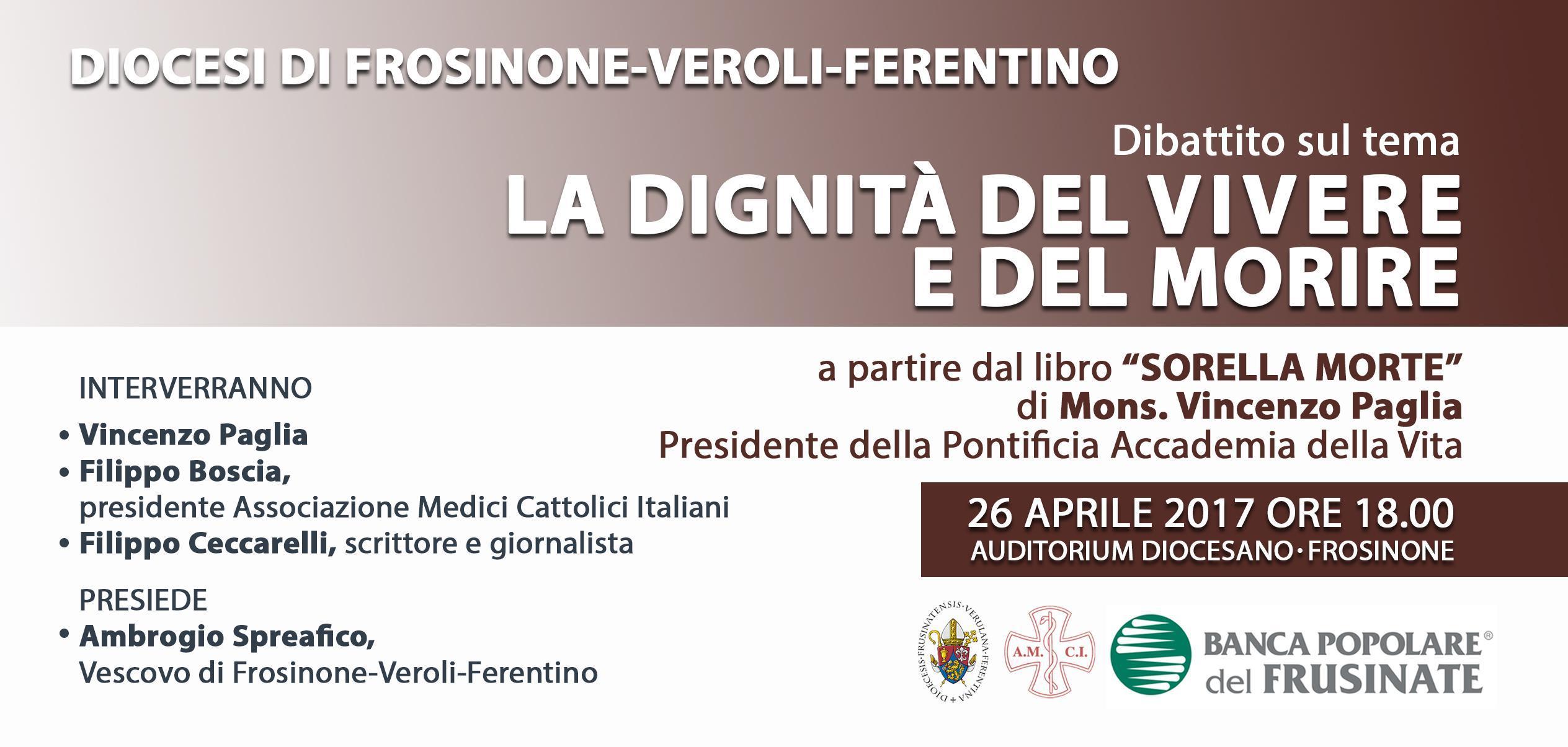 Mercoledì 26 aprile l’Auditorium diocesano ha ospitato il dibattito su «La dignità del vivere e del morire», a partire dagli argomenti e gli spunti di riflessione della pubblicazione “Sorella morte” di Mons. Vincenzo Paglia, Presidente della Pontificia Accademia per la Vita.