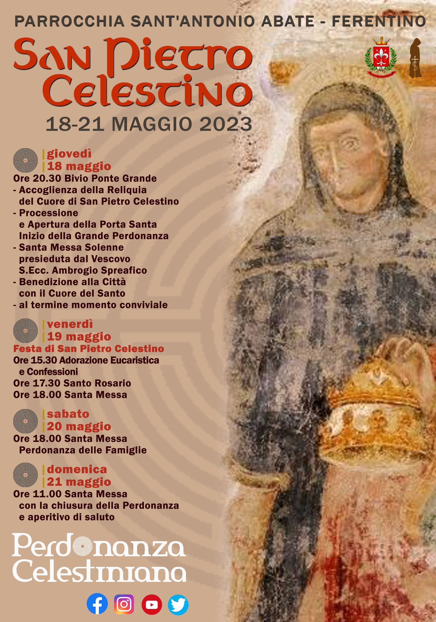Giovedì 18, alle ore 20:30, accoglienza della reliquia del cuore di San Pietro Celestino al Bivio di Ponte Grande; da qui, Processione fino alla chiesa dove ci sarà l’apertura della Porta Santa che segna l’inizio della Grande Perdonanza. E’ seguita la Santa Messa presieduta dal vescovo Ambrogio.