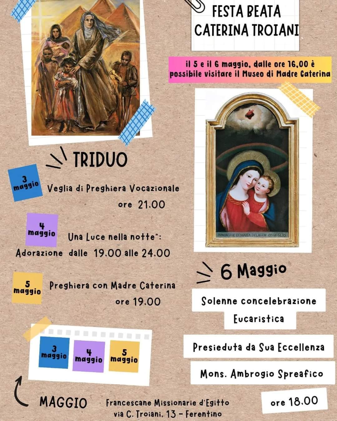 Inoltre, domenica 5 e lunedì 6 maggio sarà possibile visitare (dalle 16) il Museo di Madre Caterina.