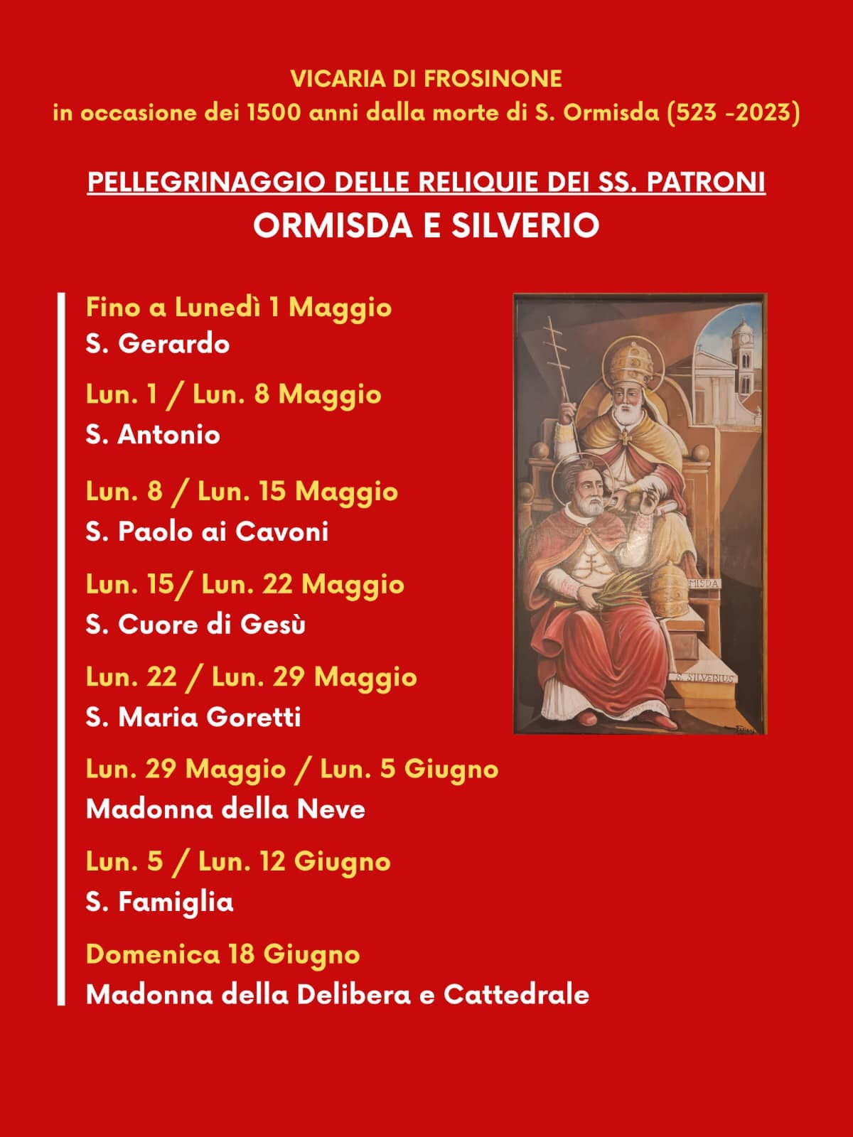 Quest’anno ricorrono i 1500 anni dalla morte di Sant’Ormisda: nativo di Frosinone, è stato pontefice dal 20 luglio 514 al 6 agosto 523 e con san Silverio è patrono della città di Frosinone.