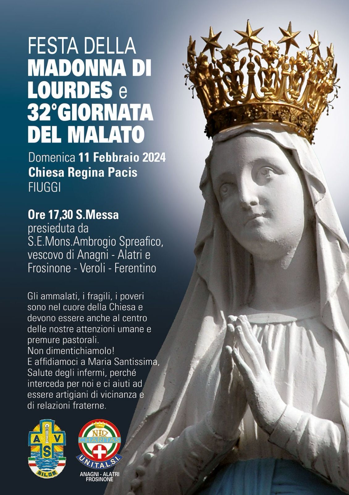 – la celebrazione eucaristica interdiocesana, per le Diocesi di Frosinone-Veroli-Ferentino e di Anagni-Alatri, presieduta dal Vescovo Ambrogio (ore 17:30, chiesa Regina Pacis di Fiuggi).