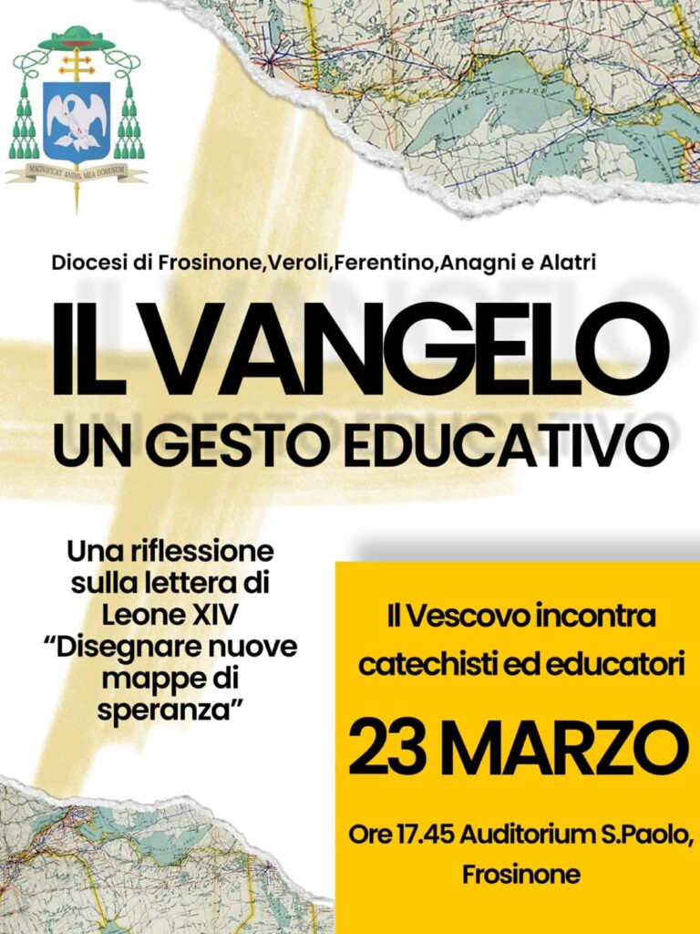 Si terrà lunedì 23 marzo, presso l’Auditorium diocesano adiacente la chiesa di San Paolo a Frosinone, con inizio alle 17.45, l’incontro dell’arcivescovo Santo Marcianò con i catechisti e gli educatori delle diocesi di Frosinone-Veroli-Ferentino-Anagni-Alatri. All’incontro è stato dato il titolo “Il Vangelo, un gesto educativo” e monsignor Marcianò guiderà una riflessione sulla Lettera di papa Leone XIV “Disegnare nuove mappe di speranza”, un documento arrivato nel 60° anniversario della Dichiarazione conciliare Gravissimum educationis sull’importanza e attualità dell’educazione nella vita della persona umana. Con quel testo, il Concilio Vaticano II ha ricordato alla Chiesa che l’educazione non è attività accessoria, ma è il modo concreto con cui il Vangelo diventa gesto educativo, relazione, cultura.