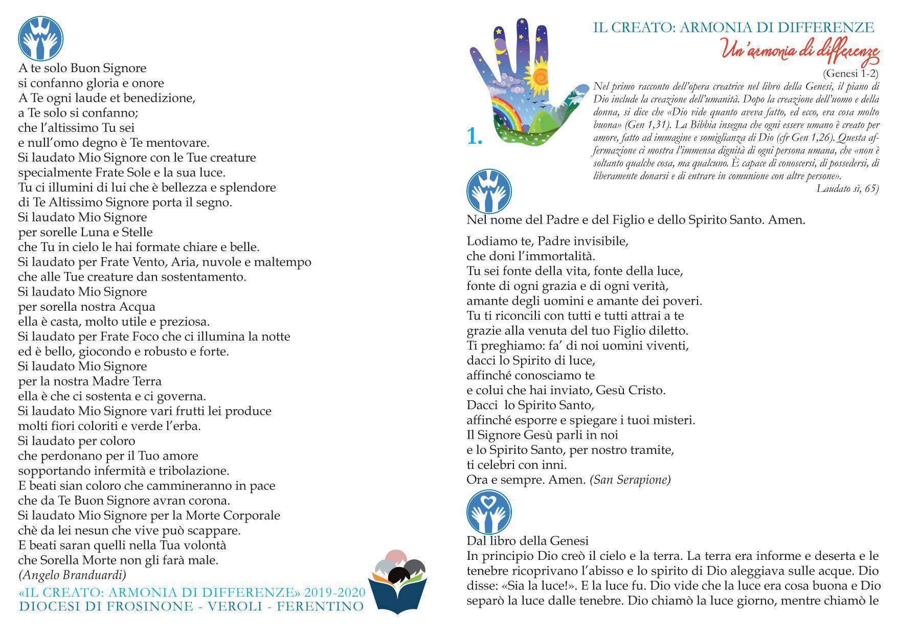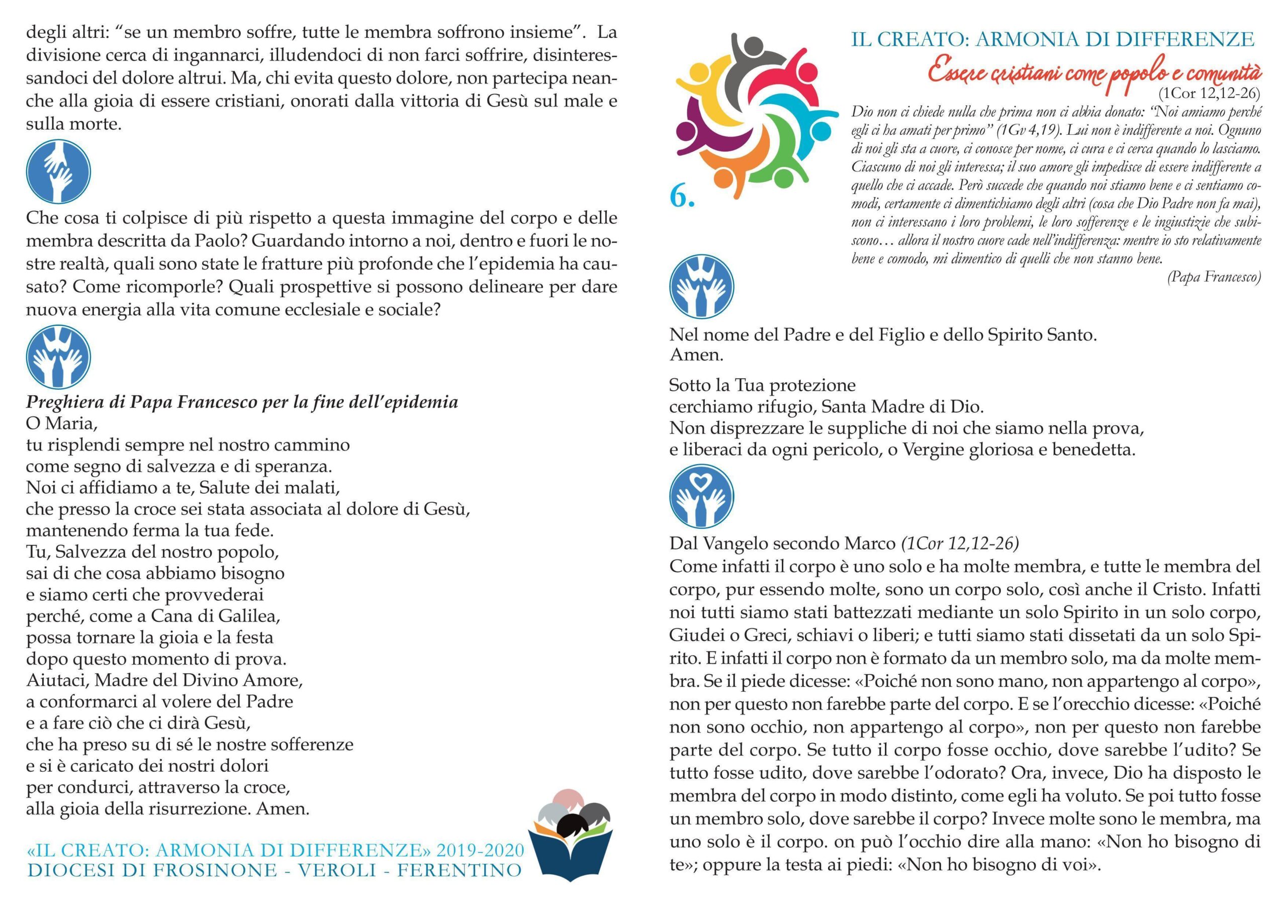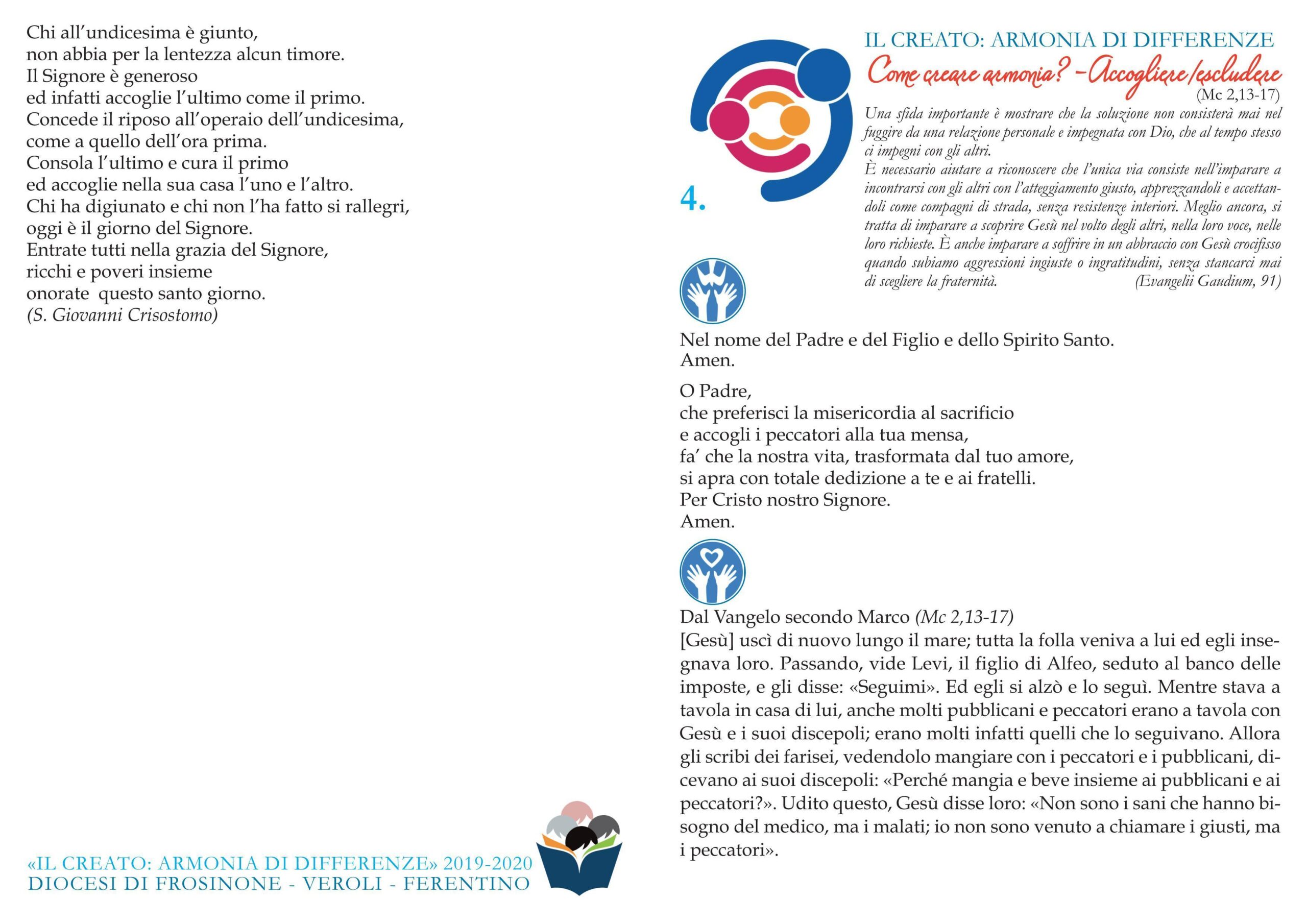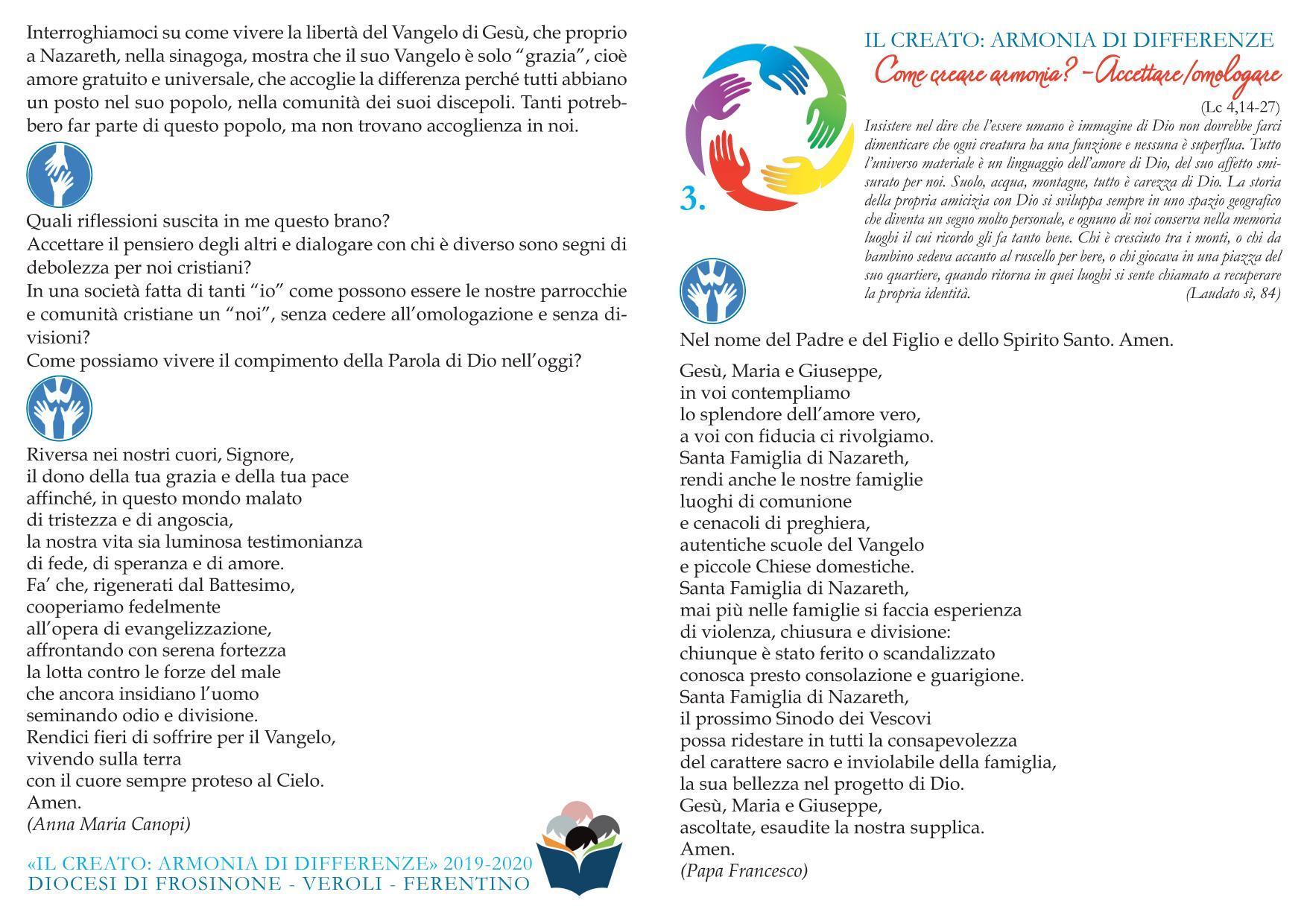Quest’anno, saranno scelti dei brani inerenti le tematiche affrontate all’Assemblea annuale (si legga l’articolo Assemblea Diocesana: 21 e 22 settembre 2019) per dare continuità alla riflessione su «Il creato: armonia di differenze», iniziata nella due giorni di Casamari e che ci coinvolgerà durante l’intero anno pastorale.