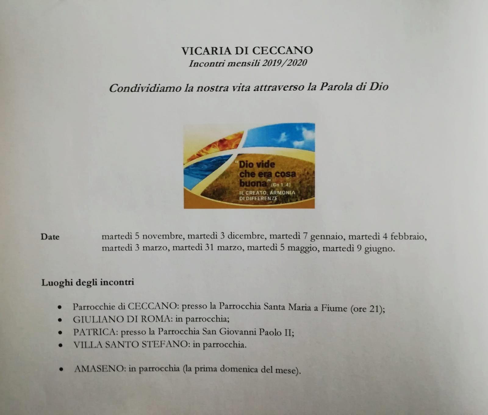 Gli incontri sono aperti a tutti e vengono organizzati presso le singole parrocchie oppure organizzati da più parrocchie: per sapere orari e luoghi degli incontri, basta chiedere informazioni presso la propria parrocchia.