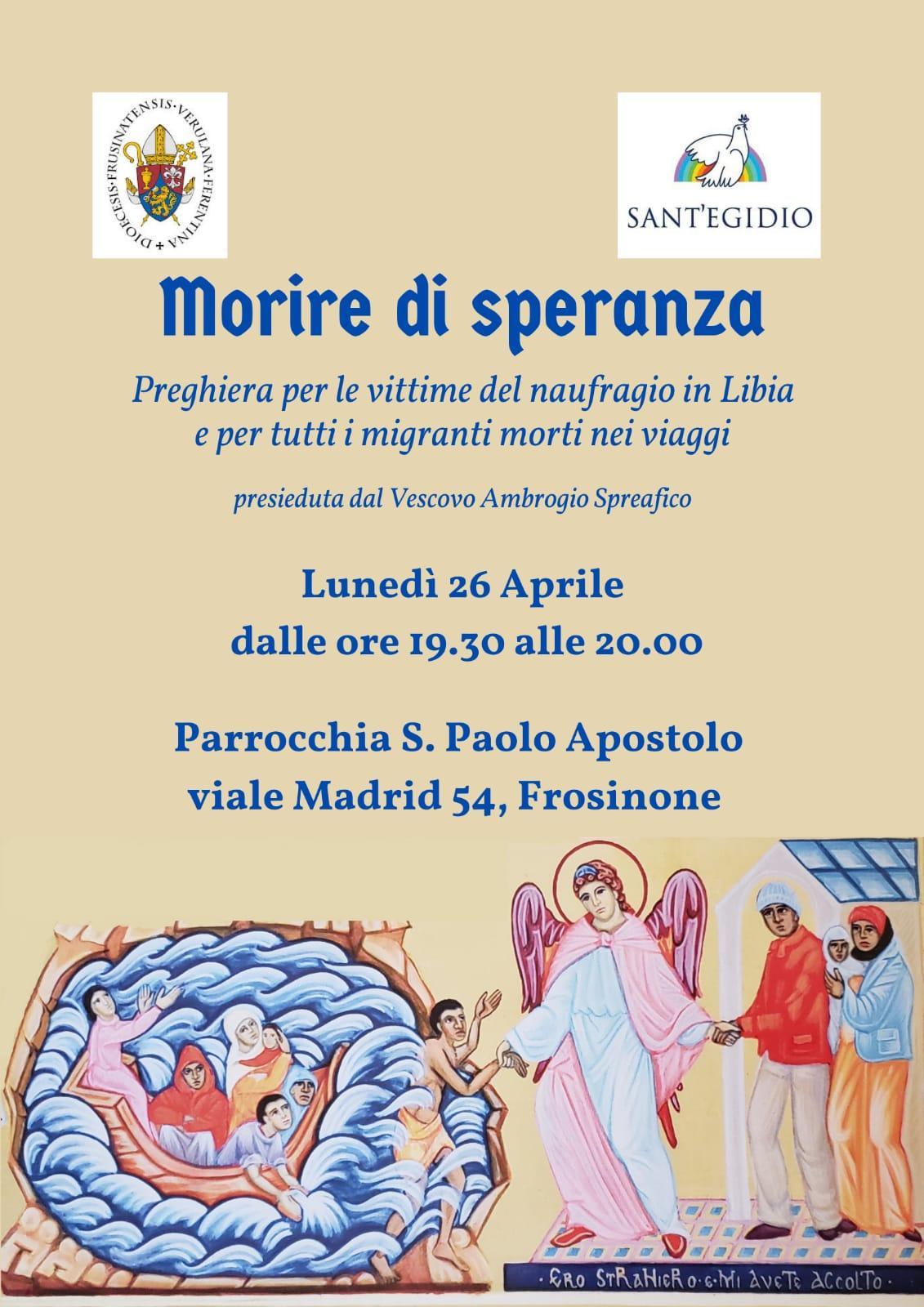 Ci siamo riuniti nella preghiera “Morire di speranza“, animata dalla Comunità di Sant’Egidio, che il Vescovo Ambrogio ha presieduto lunedì 26 aprile 2021, alle ore 19.30, nella parrocchia di San Paolo Apostolo a Frosinone.