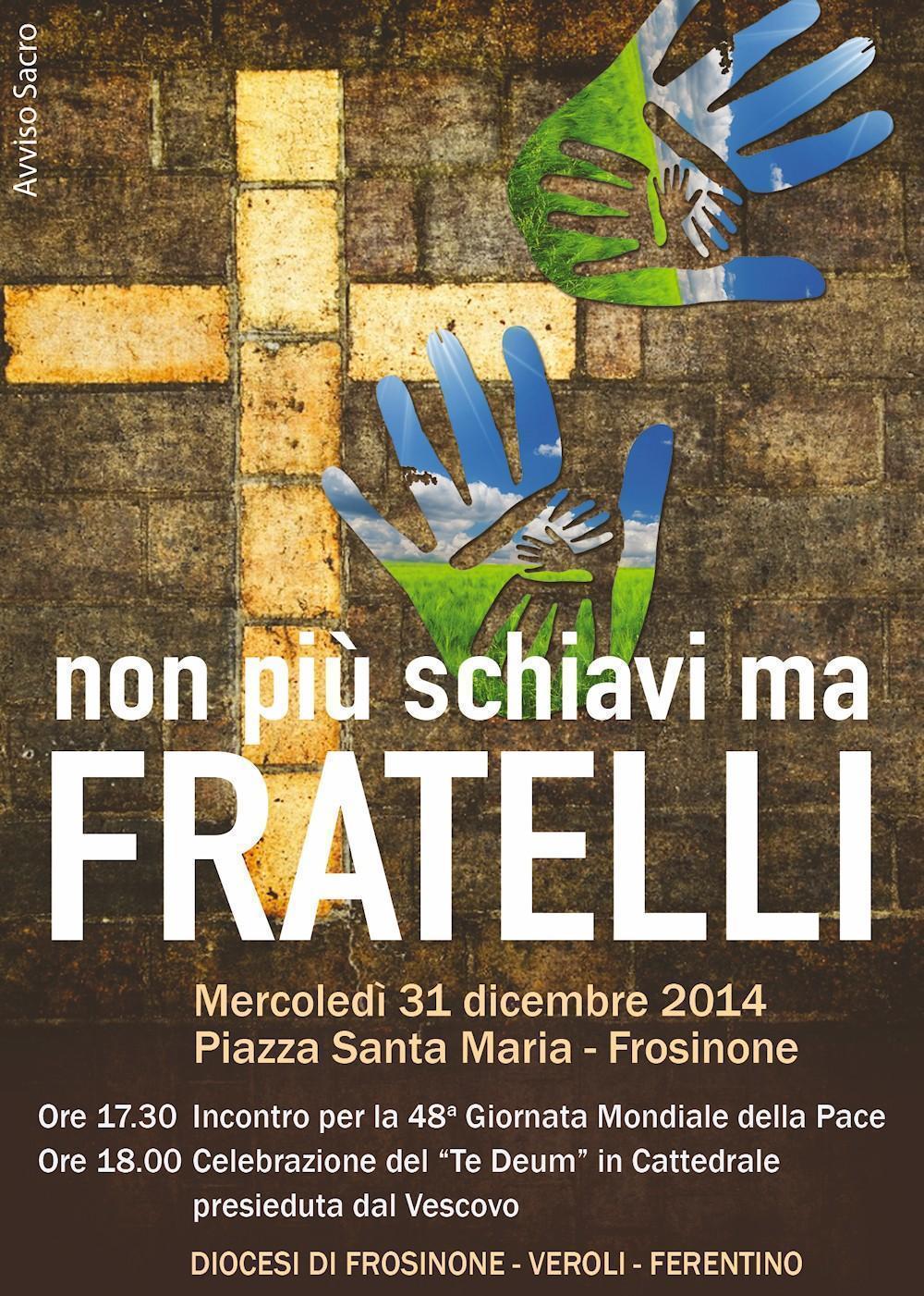 o    Mercoledì 31 dicembre: alle ore 17.30, in piazza Santa Maria a Frosinone, incontro per la 48a Giornata Mondiale della pace. Alle 18.00 Mons. Spreafico presiederà la celebrazione del Te Deum in Cattedrale. Segue l’immagine della locandina jpg31_dicembre_2014.jpg
