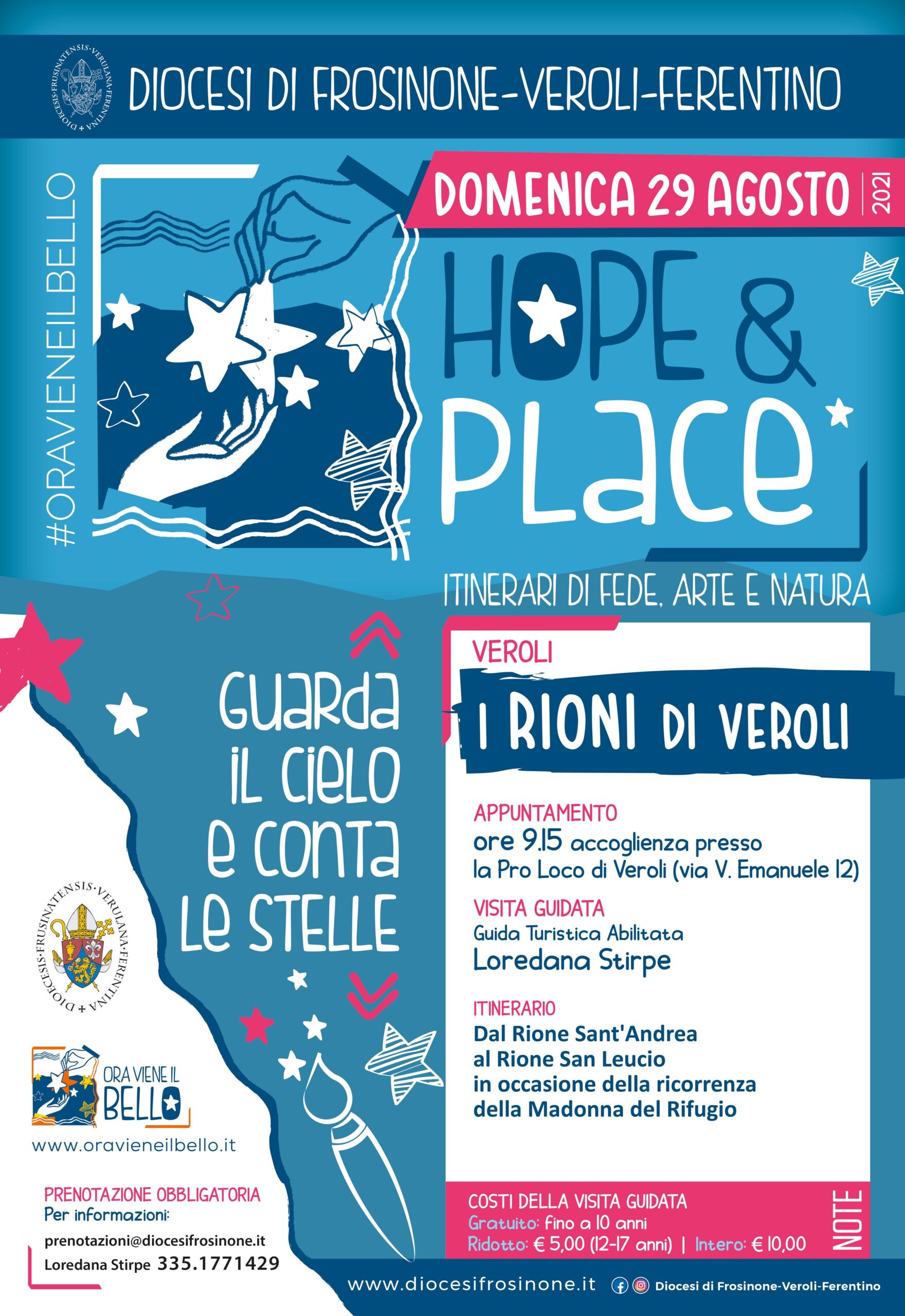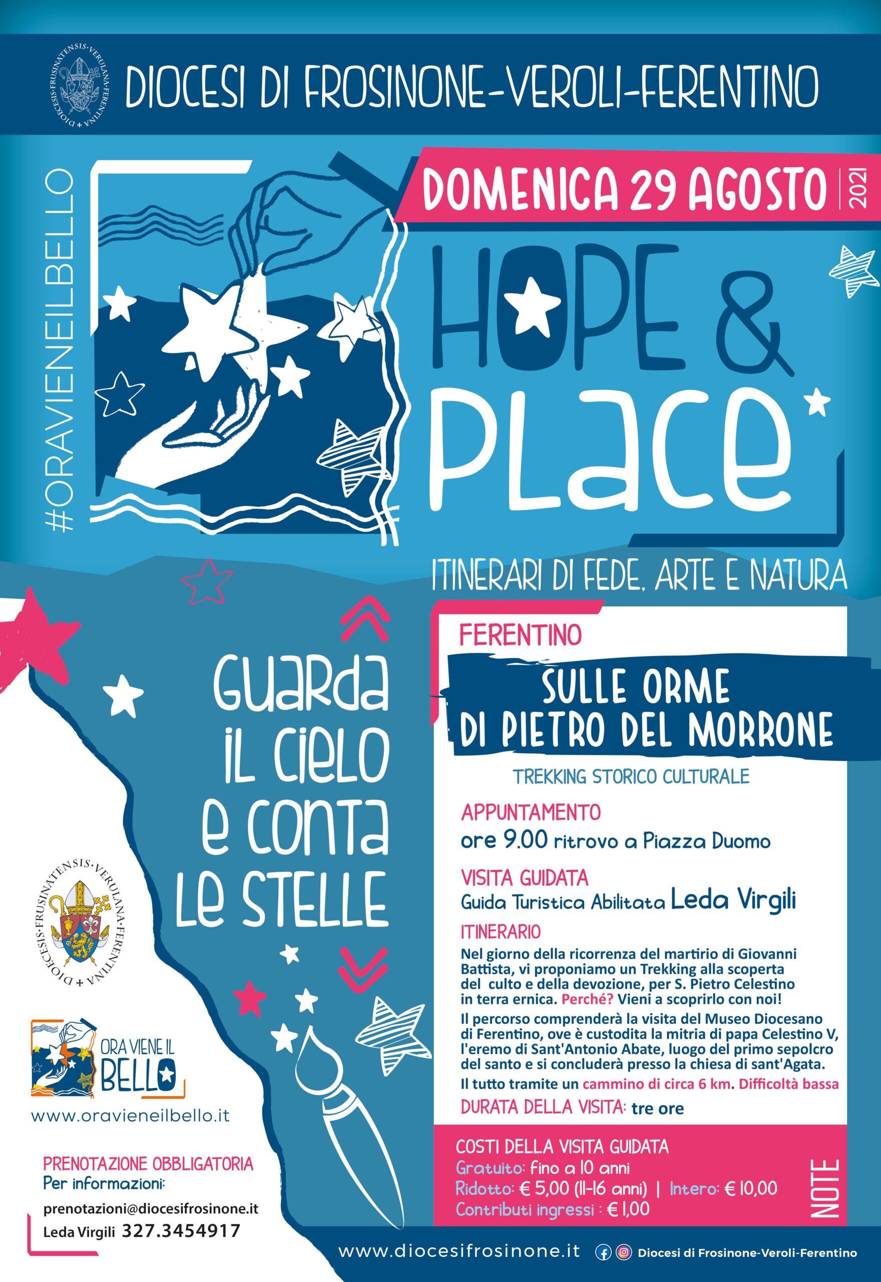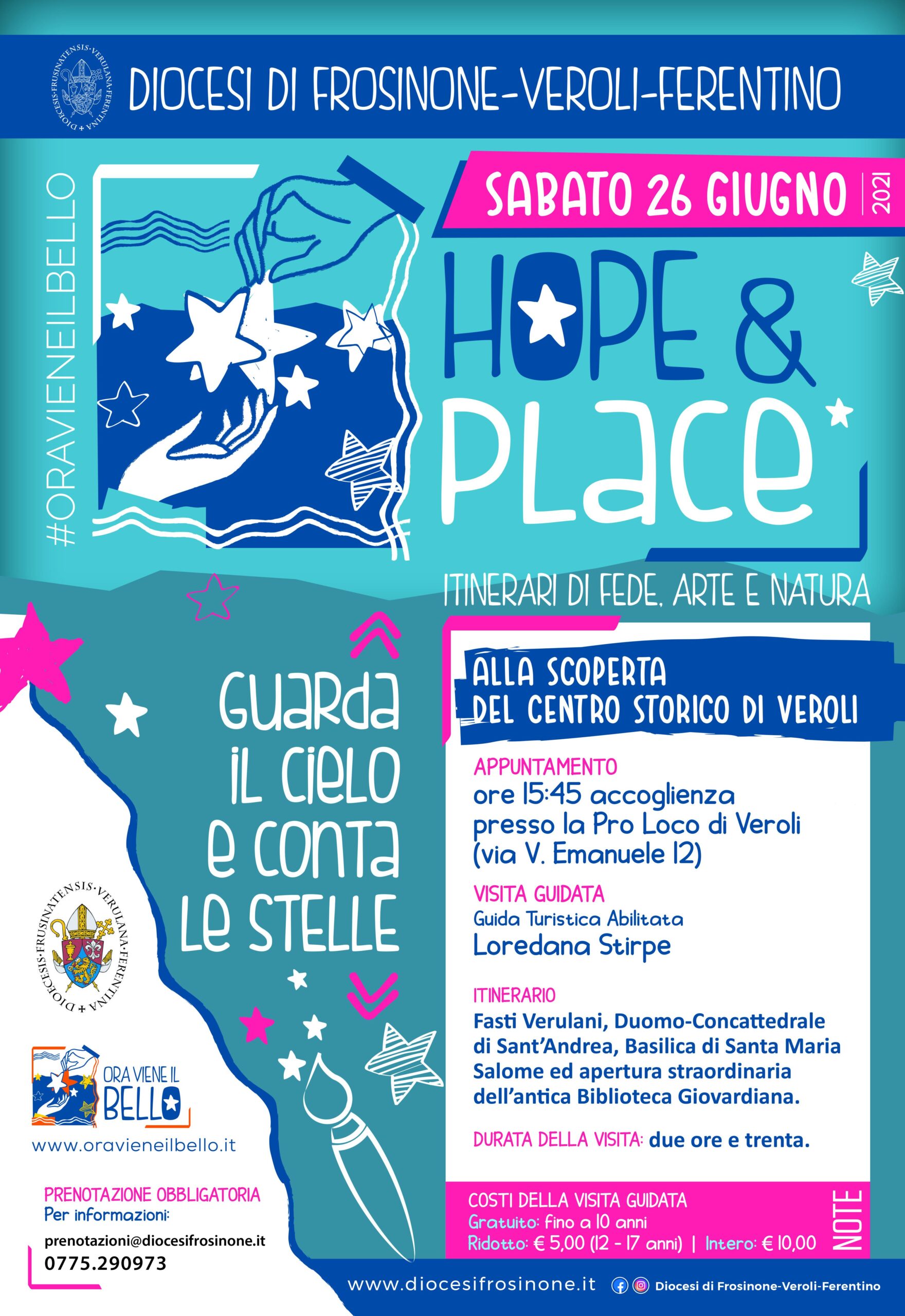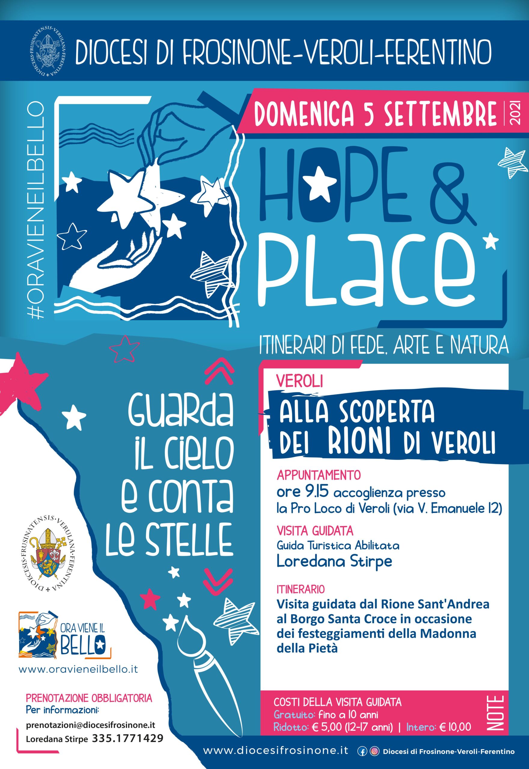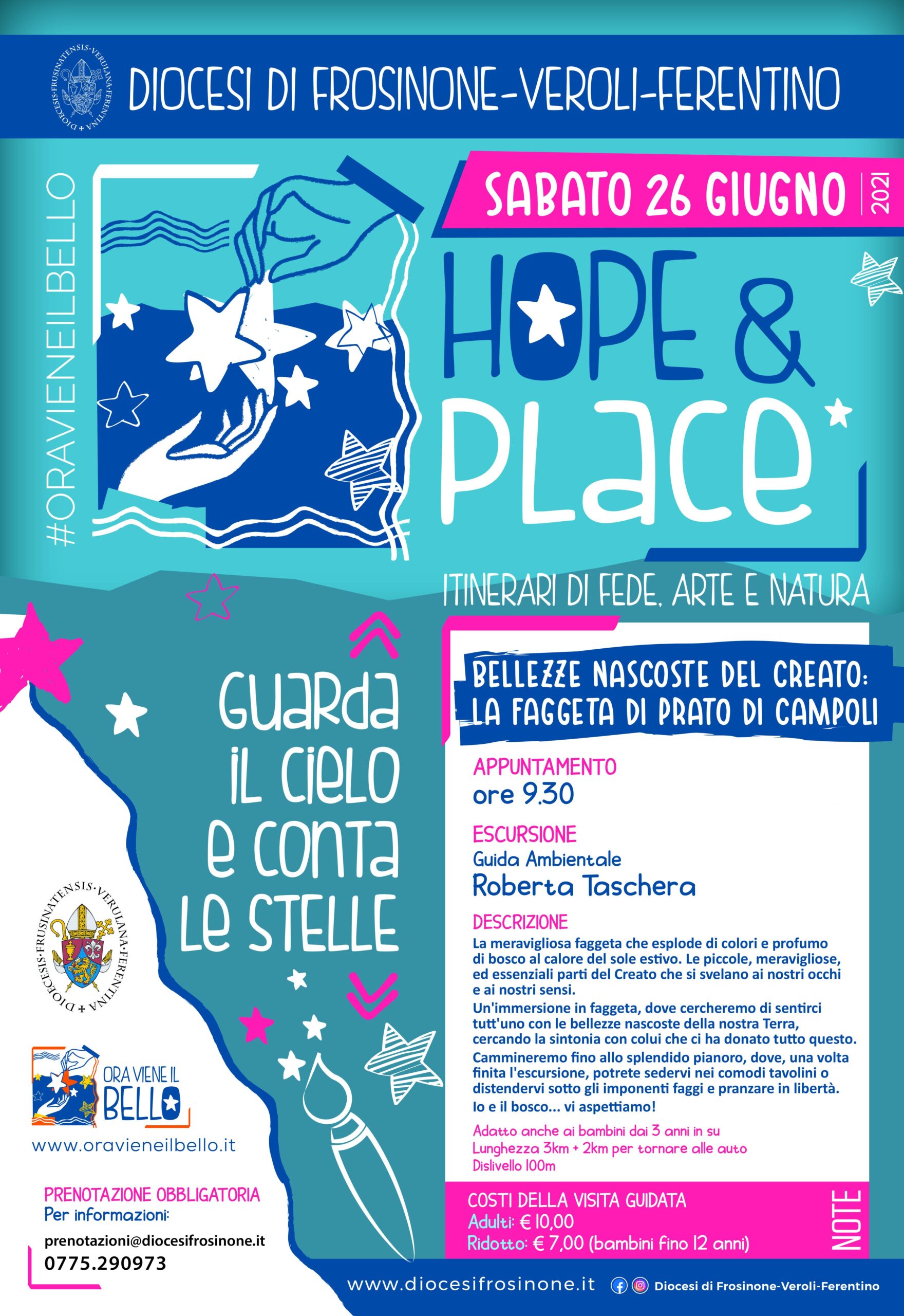 E’ stato messo a punto un calendario di “Itinerari di fede, arte e natura” con visite guidate ed escursioni in alcuni dei luoghi del nostro territorio, in sinergia con guide turistiche abilitate ed ambientali: iniziative che rientrano nella programmazione di “Ora viene il bello” denominata “Hope&Place”, per ri-scoprire la nostra terra, recuperando il valore dello stupore e della bellezza.