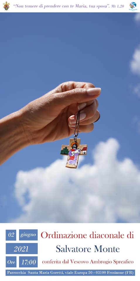 Mercoledì 2 giugno il seminarista Salvatore Monte sarà ordinato Diacono durante la celebrazione eucaristica delle ore 17:00, presso la chiesa parrocchiale di Santa Maria Goretti in Frosinone, per l’imposizione delle mani e la preghiera di consacrazione del Vescovo Mons. Ambrogio Spreafico.