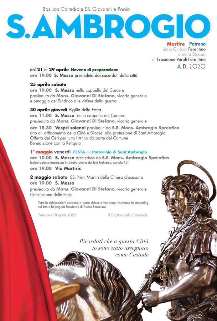 Giovedì 30 aprile, vigilia della festa: alle 11 la Messa nella Cappella del carcere, presieduta da monsignor Giovanni Di Stefano,vicario generale; alle 18:30 Vespri presieduti dal vecovo Ambrogio Spreafico, con l’atto di affidamento della città di Ferentino e della diocesi alla protezione di Sant’Ambrogio e la benedizione con la reliquia.