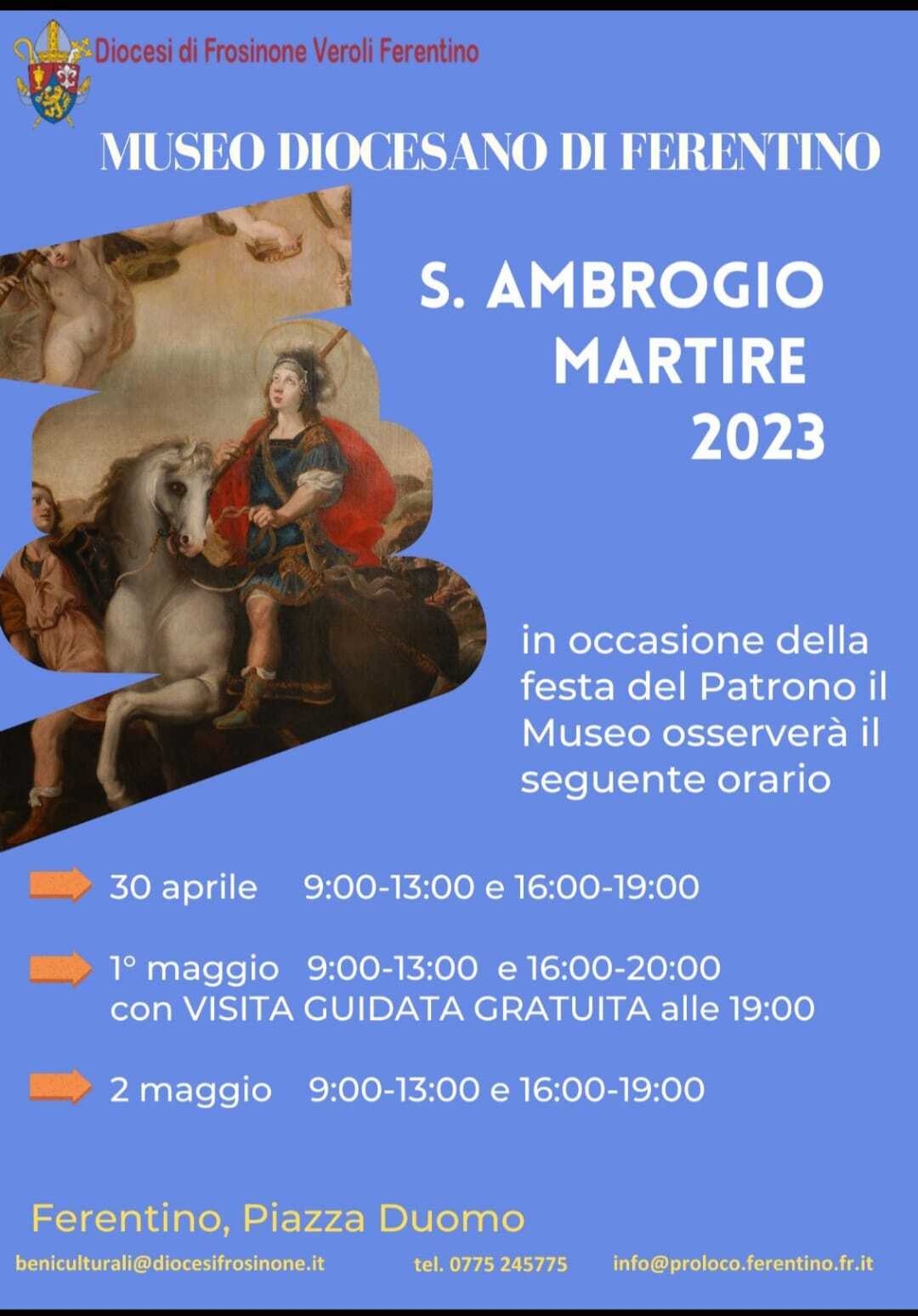 previste aperture straordinarie e una visita guidata gratuita in occasione dei festeggiamenti patronali. Nelle sale espositive è stato allestito uno spazio permanente dedicato alla devozione del patrono Sant’Ambrogio martire: accanto ai dipinti che lo rappresentano in prigione e in gloria sono esposti reliquiari e oggetti che ne ricordano la devozione nella storia (in particolare i vasi entro cui erano conservate le reliquie del Santo all’epoca della ricognizione del 1639).Si inizia domenica 23 aprile con appuntamento serale: partenza alle 21 da largo Sant’Agata per il percorso storico-culturale “Sulle orme di Ambrogio” che si concluderà proprio con una visita serale al Museo Diocesano (per informazioni, contattare la Pro Loco di Ferentino oppure le guide turistiche della Lega Ernica)