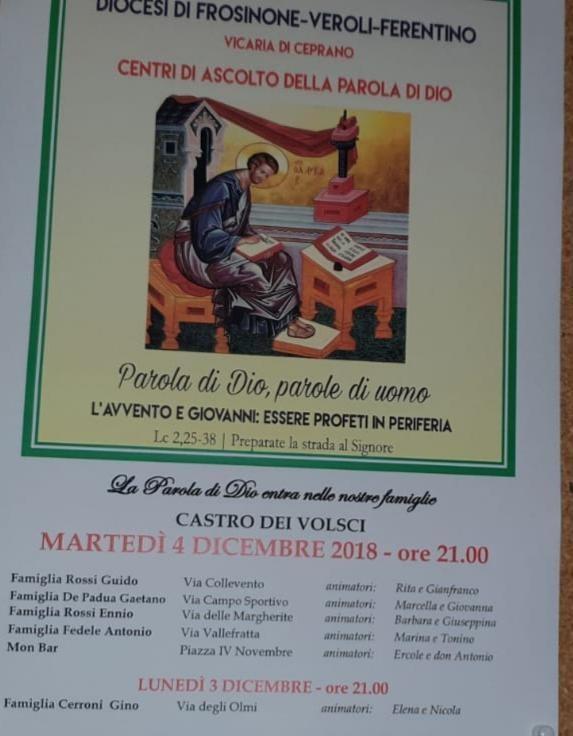 In questo Avvento 2018 il nostro Vescovo Ambrogio ci ha chiesto di prevedere degli incontri anche al di fuori della parrocchia. “Ogni comunità liberi la fantasia necessaria perché la gioia del Vangelo raggiunga più persone possibili”: questo il suo invito, che in molti abbiamo accolto e, a due a due, come i discepoli di Emmaus, ci recheremo nei condomini, nelle case ospiti di famiglie, nei centri sociali, nei bar, nei pub, … per incontrare tutti e portare a tutti la Parola di Dio.