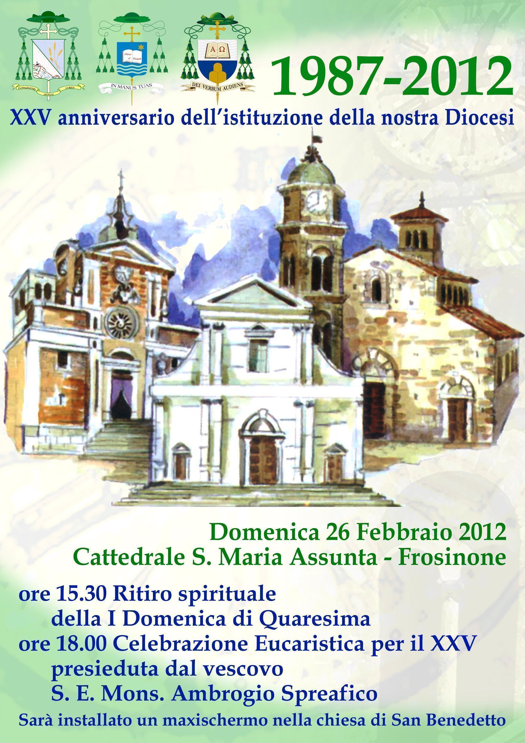 Si apriranno domenica 26 febbraio le celebrazioni per il XXV anniversario dell’istituzione della nostra Diocesi: il 27 febbraio 1987, infatti, con una concelebrazione nella Chiesa matrice di Santa Maria in Frosinone, dichiarata nuova Cattedrale della Diocesi, l’allora vescovo S.E.Mons. Angelo Cella dava solenne inizio alla nuova realtà ecclesiale.